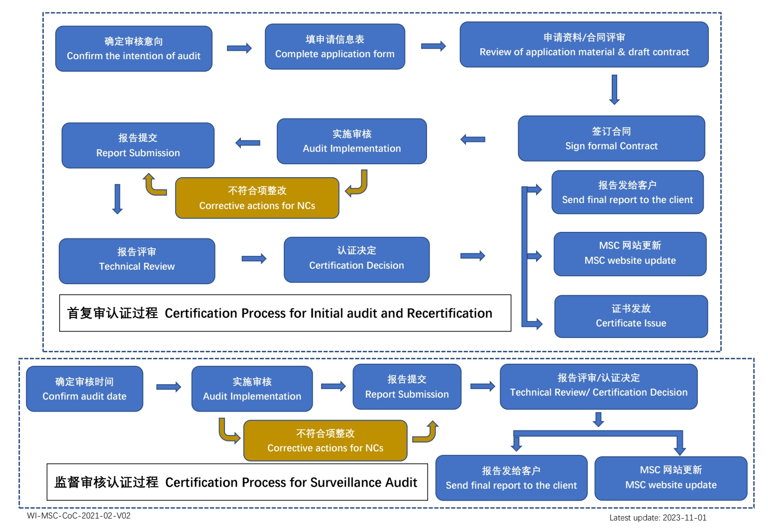 MSC CoC certification is to ensures MSC certified fish and seafood is traceable and separated from that is non-certified during circulation from the source to the final consumer.  There are 3 CoC standards for different types of enterprises.